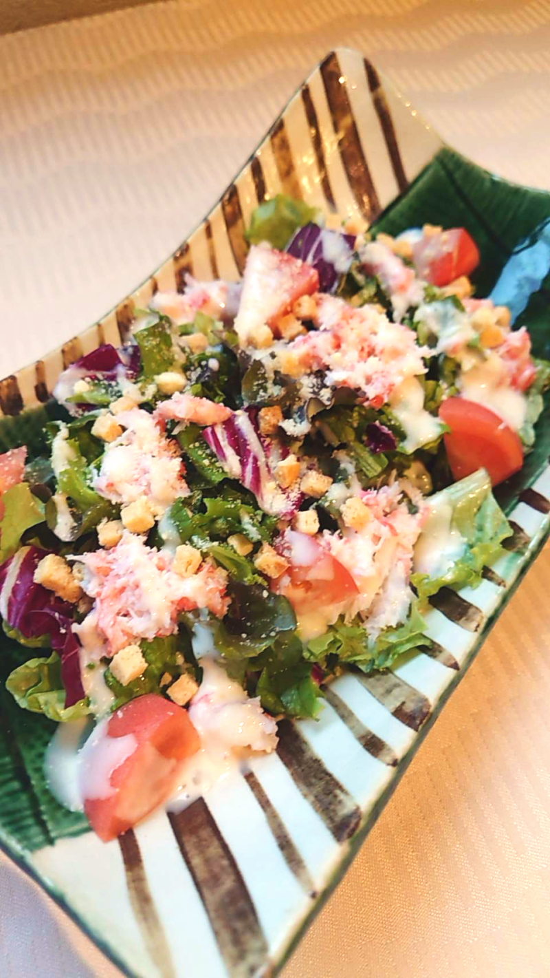 濃厚なシーザードレッシングに、蟹の甘みと旨みが絶妙にマッチ。シャキッとしたロメインレタスと蟹の繊細な身が口の中で重なり、サラダとしての満足感を超える贅沢な一皿です